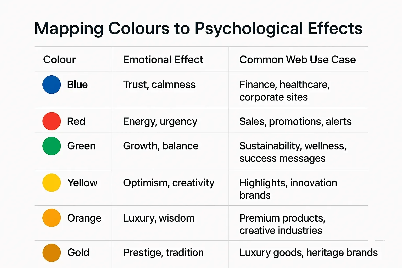 - Emotional priming: Colours can evoke trust, urgency, calm, or excitement before a user reads a single word.