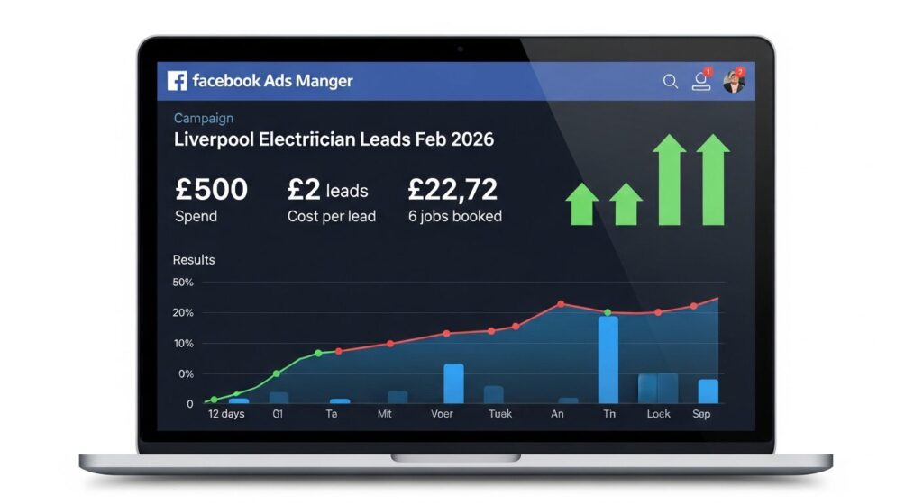 To move beyond assumptions, we ran a structured £500 Facebook ad campaign for a Liverpool-based electrician. The objective was clear: generate qualified local enquiries within a realistic service radius.